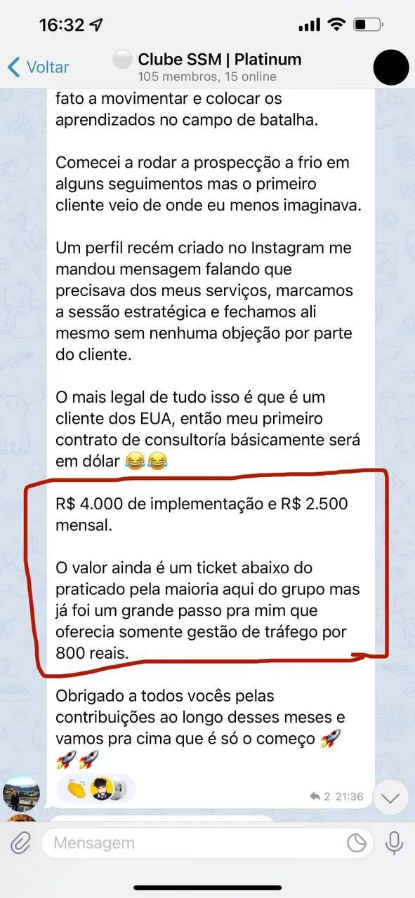 Depende. Temos divisões diferentes dentro do clube onde, dependendo do seu nível, te encaminhamos para o caminho que mais faz sentido para o seu momento e o momento do seu negócio. O seu mentor na sessão estratégica te ajudará a enxergar isso, caso ele veja que você tem o perfil do nosso tipo de cliente ideal (o que conseguimos gerar mais resultados em menor tempo possível) ele te mostrará a melhor opção e como conseguimos te ajudar da melhor forma possível.